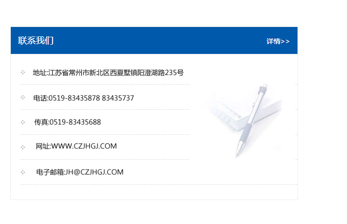 傳真:0519-83435688    郵編:213135    網(wǎng)址:WWW.czjhgj_com.zyxscn.com    電子郵箱:JH@czjhgj_com.zyxscn.com